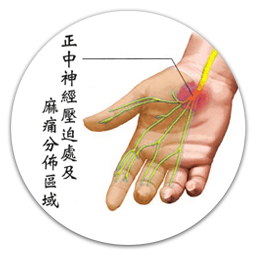 什麼是[手腕隧道症候群] 很多中年婦女或經常需要手部勞動的從業人員,常抱怨睡覺時或清晨時手部麻、痛,必需要爬起兩手甩一甩、或手抬高、或手浸泡熱水,才能舒服一點;中指、食指及大拇指兩側均有症狀(圖一),在工作時會更麻,騎車時雙手無力,轉不動油門,麻痛會向上延伸到前臂處,另外皮膚感覺會不靈敏,肌肉力量減退,拿東西會不自主地滑掉,甚至手掌大拇球肌肉萎縮,這些都是[手腕隧道症候群]的臨床表現。