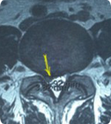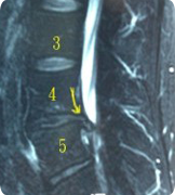 林先生磁振造影檢查有嚴重的第4-5腰椎間盤退化,並向後下方突出,壓迫了神經根,脊管內的脊髓液及神經。